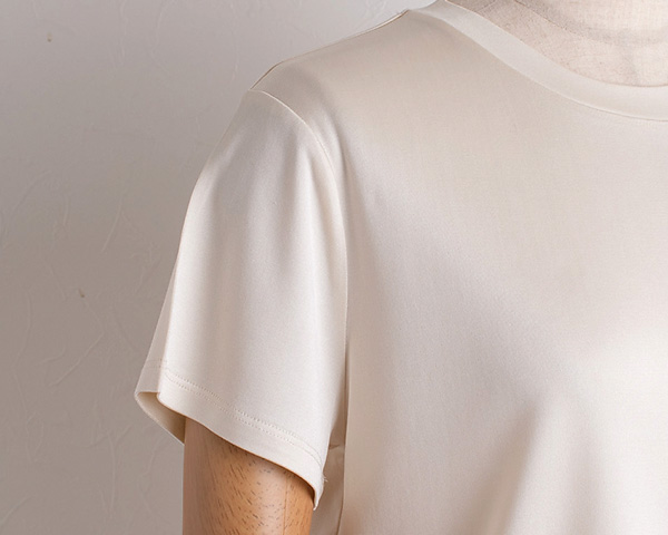 地厚のシルク100%スムース素材で仕立てたトップスは表も裏もしっとりすべすべな肌触り。一度身に着けるともう手放せないほど、うっとりするような着心地です。吸放湿性に優れたシルクだから、汗をかいてもすぐにサラサラ。一年中快適にお召し頂けます。