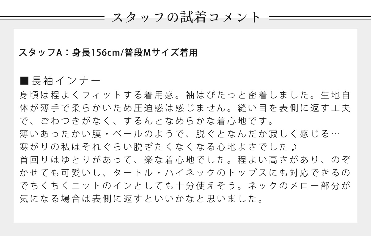 ●薄手で響かず、一枚重ねてより温かく過ごせるインナー【ハイネックタイプ】