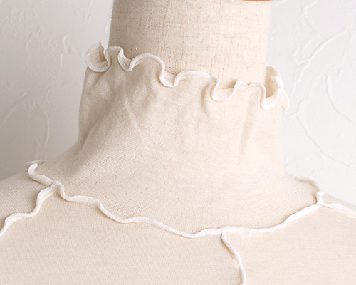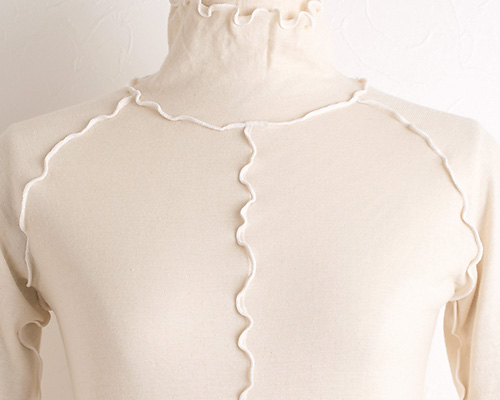 • 縫い目は襟ぐり・脇繰り・身頃中央・袖下にあり全て表側に返してメロー仕上げにしました