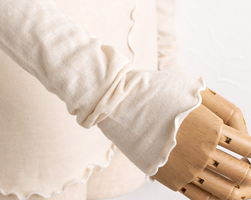 肌側はシルク100%。吸放湿性に優れた絹だから、寝汗を吸収してくれ、不快感を軽減。 外側のコットン生地との間に空気をため込むので、ふんわりソフトな生地感で、気持ちのよい肌触り。 保温性もあるので、薄手なのにあったか。肌寒い季節のインナーとして一枚重ねるだけで着心地がグレードアップします。