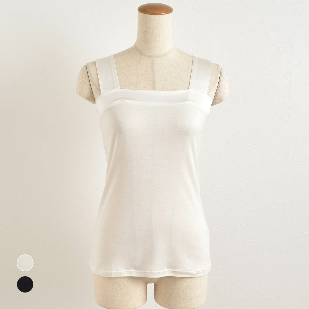 ●太めの肩紐とベアトップ風のデザインでブラ紐や胸元をカバー ●デコルテ部分と肩紐はシルクサテンだから、アウターから覗いても上品 ●吸放湿性や保温性に優れたシルクで、汗ばむ季節の汗取りや、冷えとりインナーとして一年中活躍 ※身生地部分は透けます。モデルはインナーを着用しています