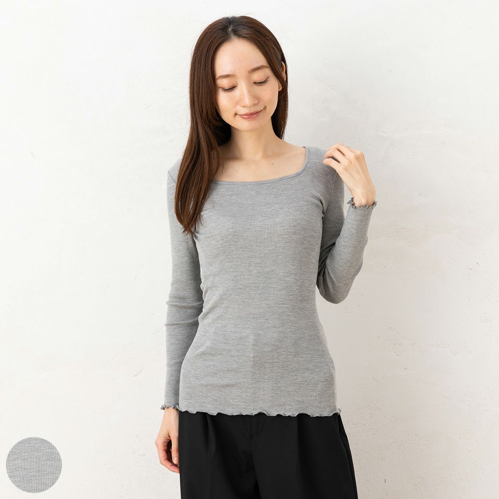 横に良く伸びるリブ編み仕立てのシルク インナーはボディにぴったりフィットしてくれます。 かさばりにくい薄手のインナーですから、重ね着してももたつきません。 すっきりしたデコルテのスクエアネックでアウターに響きにくく着回しやすいデザイン。 両脇に縫い目のないサイドシームレスだから、ゴロつきがなく快適な着心地に。 おしゃれな杢調カラーでチラ見えしても気になりません。