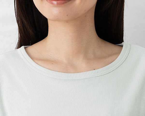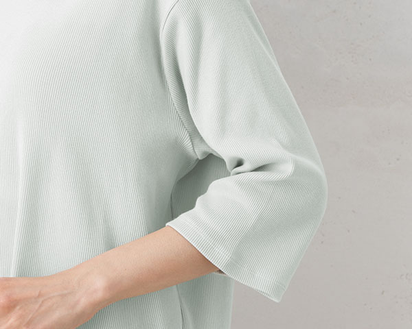 オーガニックコットンは、3年以上農薬や化学肥料を使わない農地で 栽培された綿のことをいいます。手間をかけながら、昔ながらの自然な栽培方法で作られた環境にも人にも優しい綿繊維は、空気をたくさん含み、ふっくら心地よい感触で素肌を包みます。そのため、敏感肌さんにもぜひおすすめしたい素材です。柔らかく薄手の素材感で畝状になったテレコ素材は適度に伸びて、お肌にそっと寄り添います。 凹凸が汗をかいてもベタつきにくく、さらりとした肌触りに。