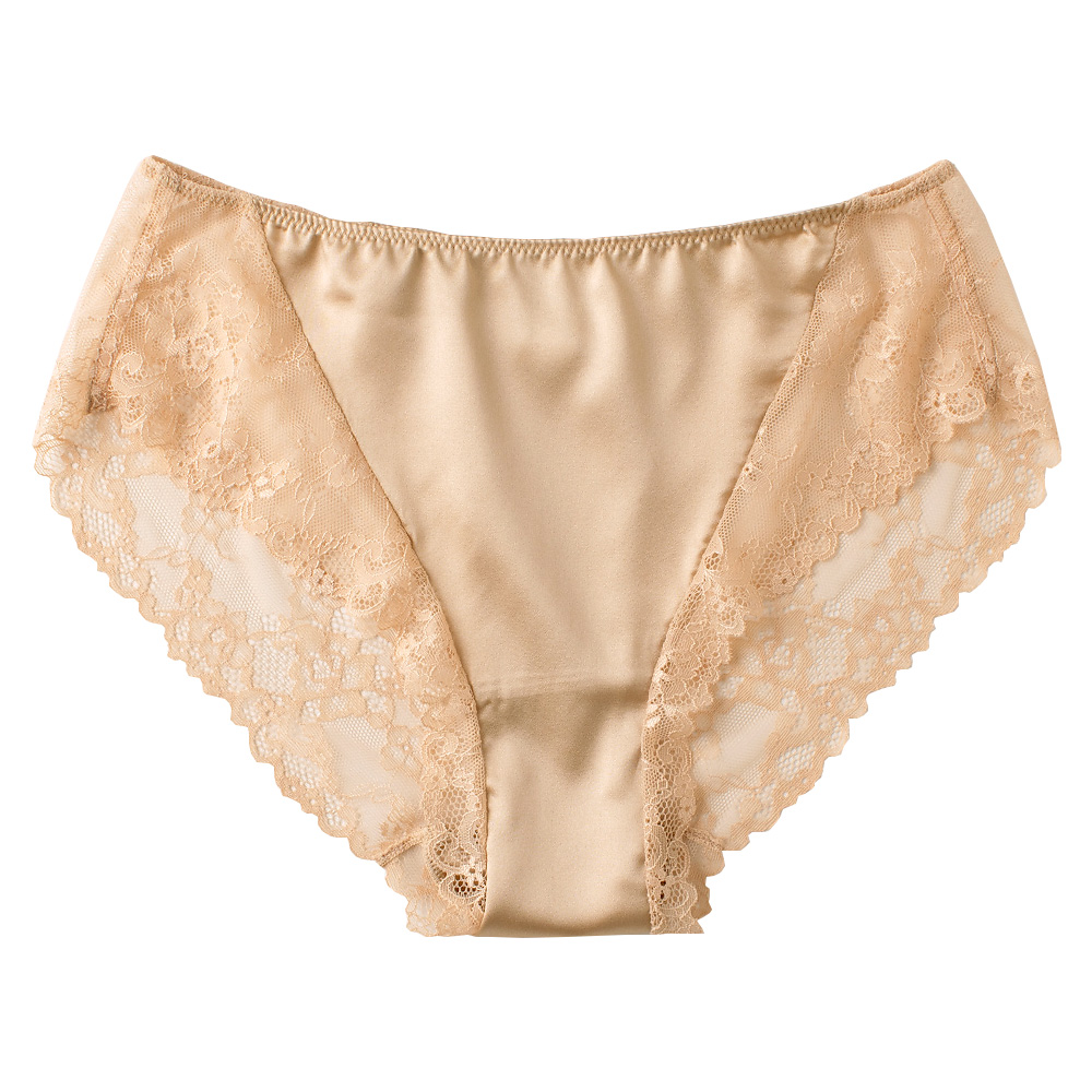 ●フロントからマチ~ヒップ側中央にシルクサテンを使い、お肌に優しいさらりとした肌触り ●レース×シルクサテンのラグジュアリーなデザイン ●足繰りにストレッチレースを施しているからアウターに響きにくい