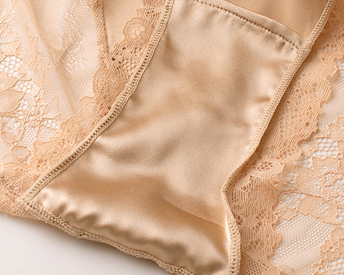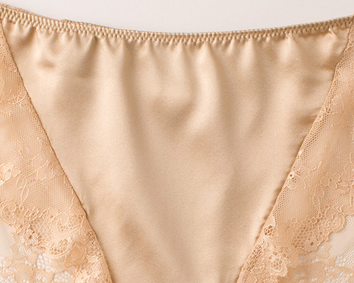 フロントはすべすべのシルクサテンで仕立て、ほんのり艶感が美しい。シルク特有のしっとりした肌触りと艶感を持つシルクサテンは、汗をかいてもべたつきにくく、快適に過ごせます。 ヒップ側は中央がシルクサテン、サイドからヒップにかけてレース仕立てで透け感があり、レース本来の美しさを堪能できます。アウターにも響きにくく、タイトなパンツスタイルもきれいに着こなせます。