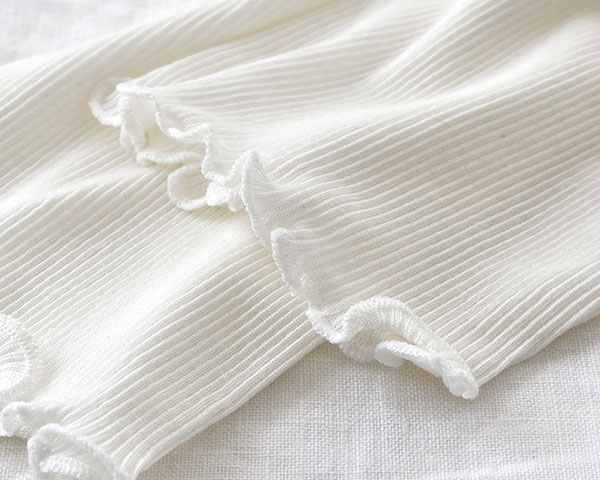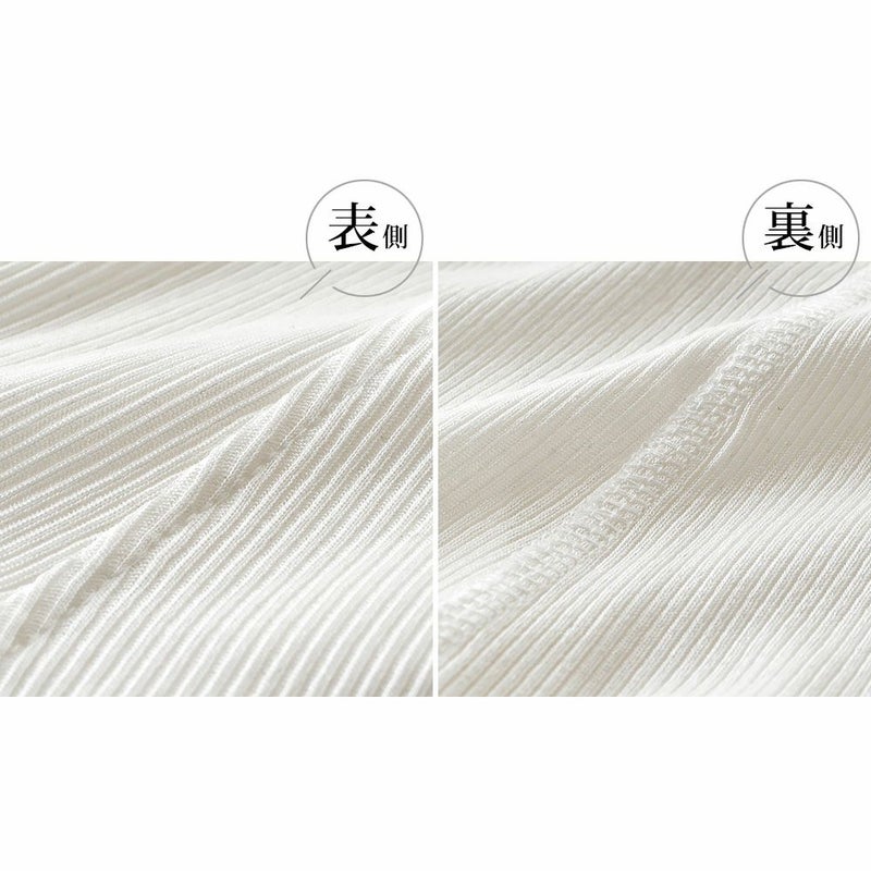 ほのかな光沢感が上品なコットンシルクのテレコ生地。テレコ素材とは凹凸のあるリブ織りの一種で、リブの凹凸が同じ数になっていて、はっきりとうねが分かるように織られています。 伸縮性がよくさらりとした肌触りで、シルク生地のなかでも比較的毛玉になりにくい素材です。