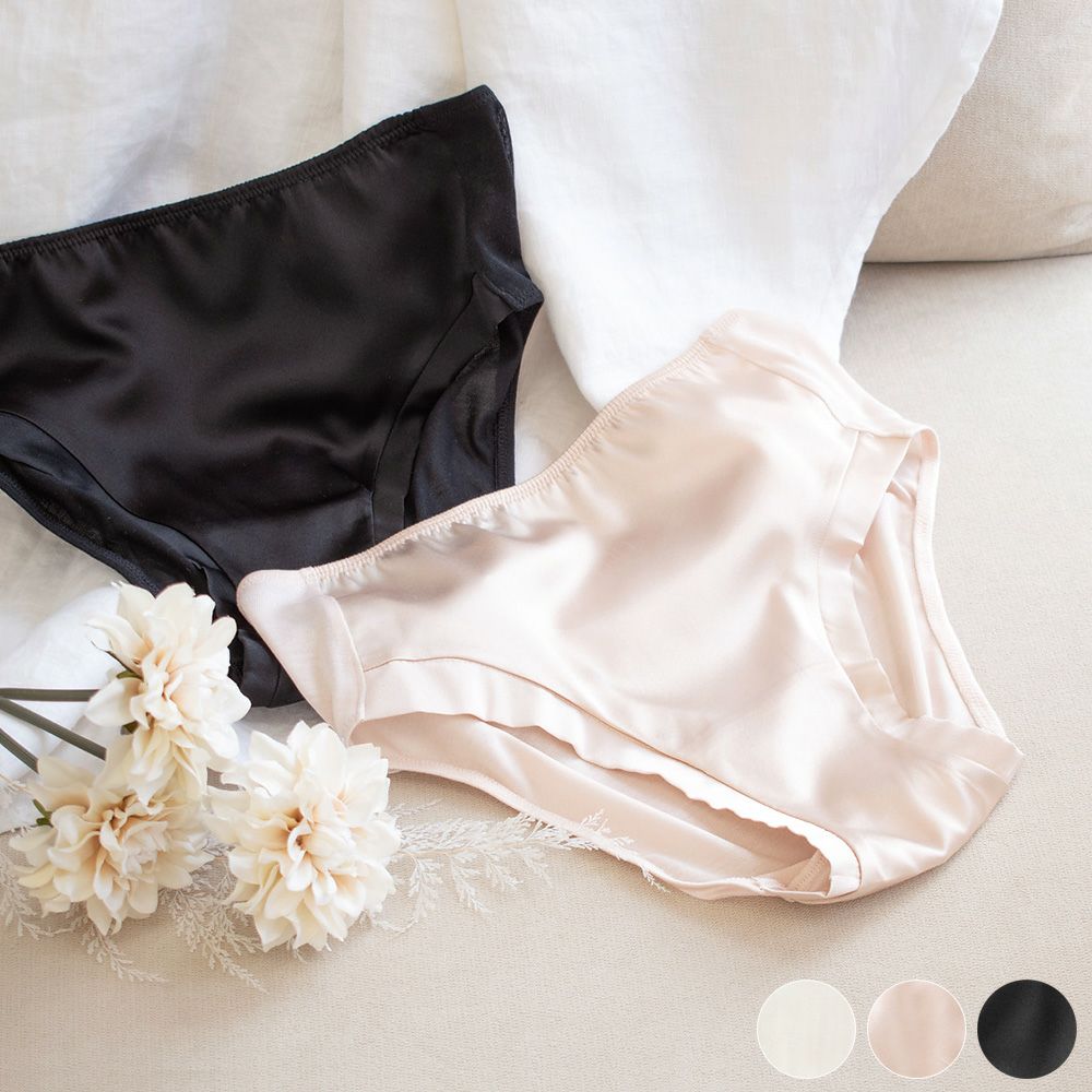 ●高級感のあるシルクサテンと柔らかなふわ肌シルクで仕立てた贅沢ショーツ ●デイリー使いにぴったり。ヒップをやさしく包み込むスタンダードデザイン ●フロント側の足繰りにゴムがないから締め付け感なく楽な履き心地