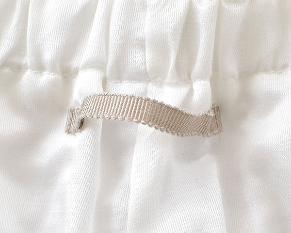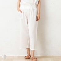 ●天然素材100%。コットンシルクサテン生地で仕立てた、夏を快適に過ごすためのルームパンツ ●薄手の生地が、風を纏うように軽く、肌にさらりと心地よい肌触り ●サテン織特有の艶感が上品な一枚
