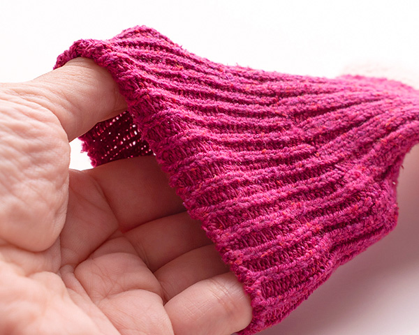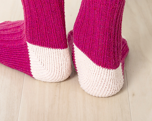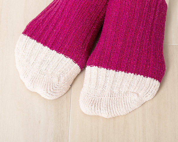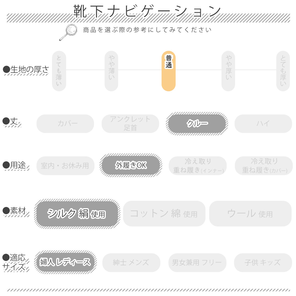 絹糸の短繊維を集めて紡いだエコシルク"GINGA"糸を使用 ほっこりとした質感の糸でナチュラルな風合いに仕上がっています。 密に編み上げ、透け感のないしっかりした生地に。 シルク91%の高混率で、蒸れにくくさらりとした履き心地です。
