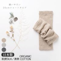 お肌に触れる内側はシルクニット(紬糸)。シルクの繊維にはミクロ単位の隙間がおおく、3分の1も空気層であるため、保温性にとても優れています。表側はふっくら柔らかなオーガニックコットン(3年以上農薬や化学肥料を使わない農地で栽培された綿)ニットを使用しました。シルクニットの上にオーガニックコットンニットを被せることによって保温力は抜群に!さらに熱の伝導率を抑える結果、冬は温かくなり、同時に湿気を素早く離散させる結果、夏の冷えとりアイテムとしてもおすすめできます。