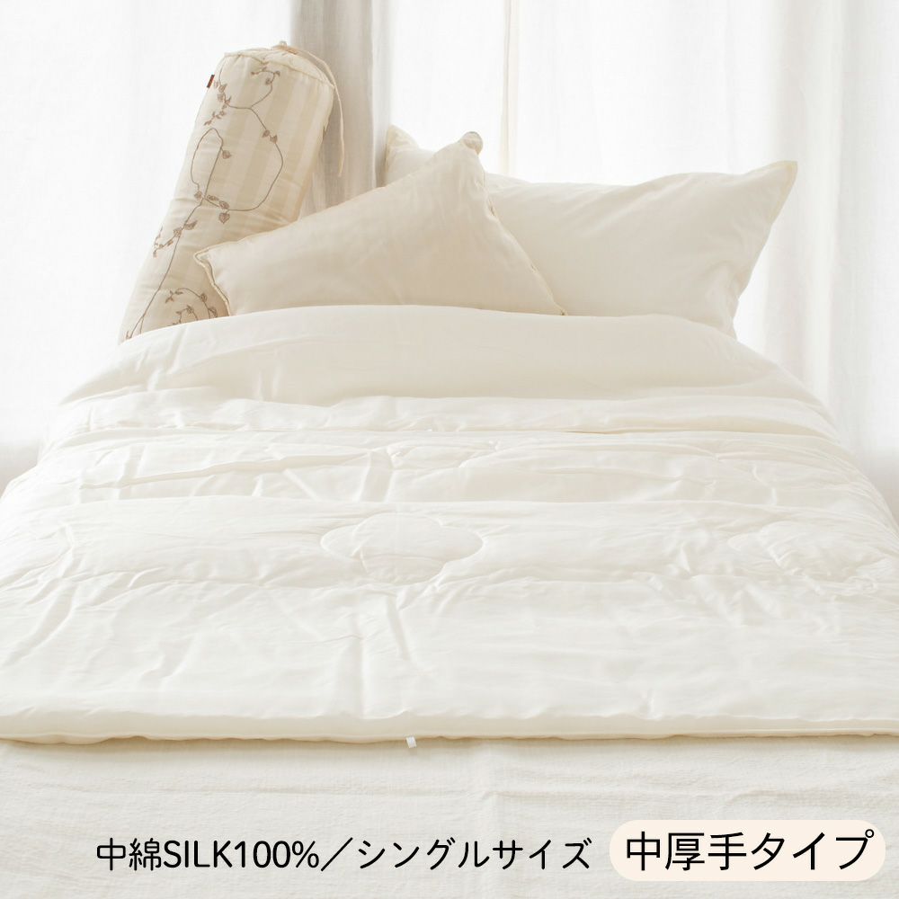 【側生地:テンセル100%】 表面には植物由来のテンセル素材を使用。ほんのりと艶感があり、なめらかな肌触りは、敏感肌の方やお子様にもおすすめの上質さです。 【中綿:シルク100%真綿】 シルクは木綿の約1.5倍の吸湿性があり、放湿性も兼ね備えています。寝汗などの湿気を吸い取って放出するため、夜中に蒸れて寝心地が悪くなったり、不快で目覚めたりすることが少なくなります。 また、シルクの繊維は多くの空気を含むことができるので、寒い時期は温まった空気層が身体を包み、保温性を発揮してくれます。気候の変化や夏の冷房から体を優しくお護りする、上質な一枚です。