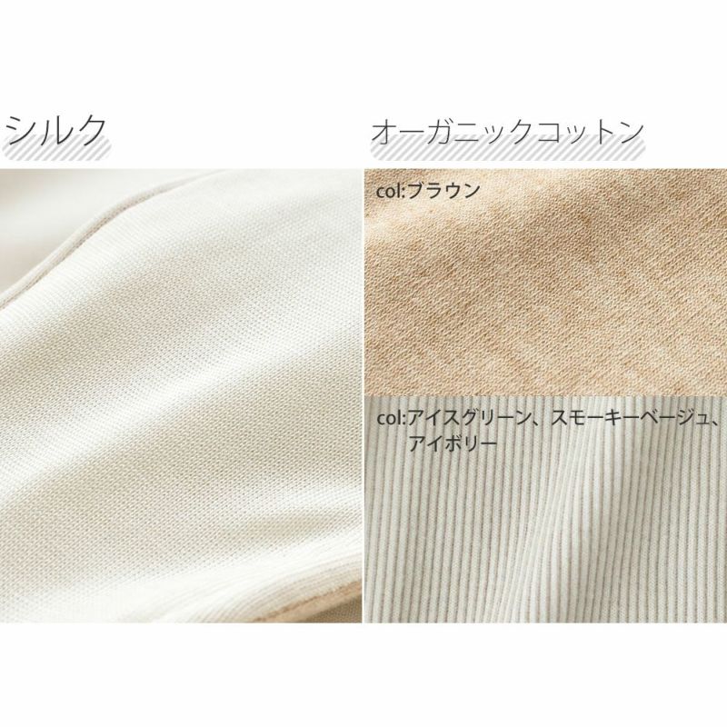 シルクはふんわりと軽やかな「ふわ肌シルク」生地を使用。ソフトで滑らかな肌触りです。シルク面、オーガニックコットン面、どちらの面でもご使用いただけます。