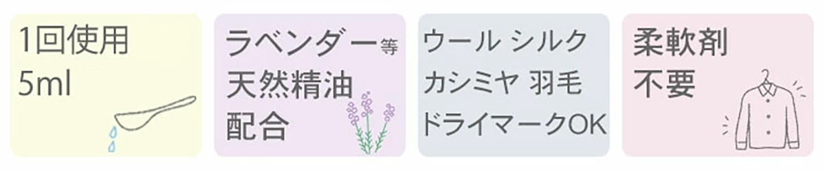 柔軟剤不要!おしゃれ着・ドライマークOKの中性洗剤 ウールやシルク、カシミヤ、ドライマークはもとより、ダウンやレインウェアなどの防水浸透性素材の衣類も洗えます。繊維一本一本が立ち上がりふんわり仕上がるから柔軟剤は不要です。
