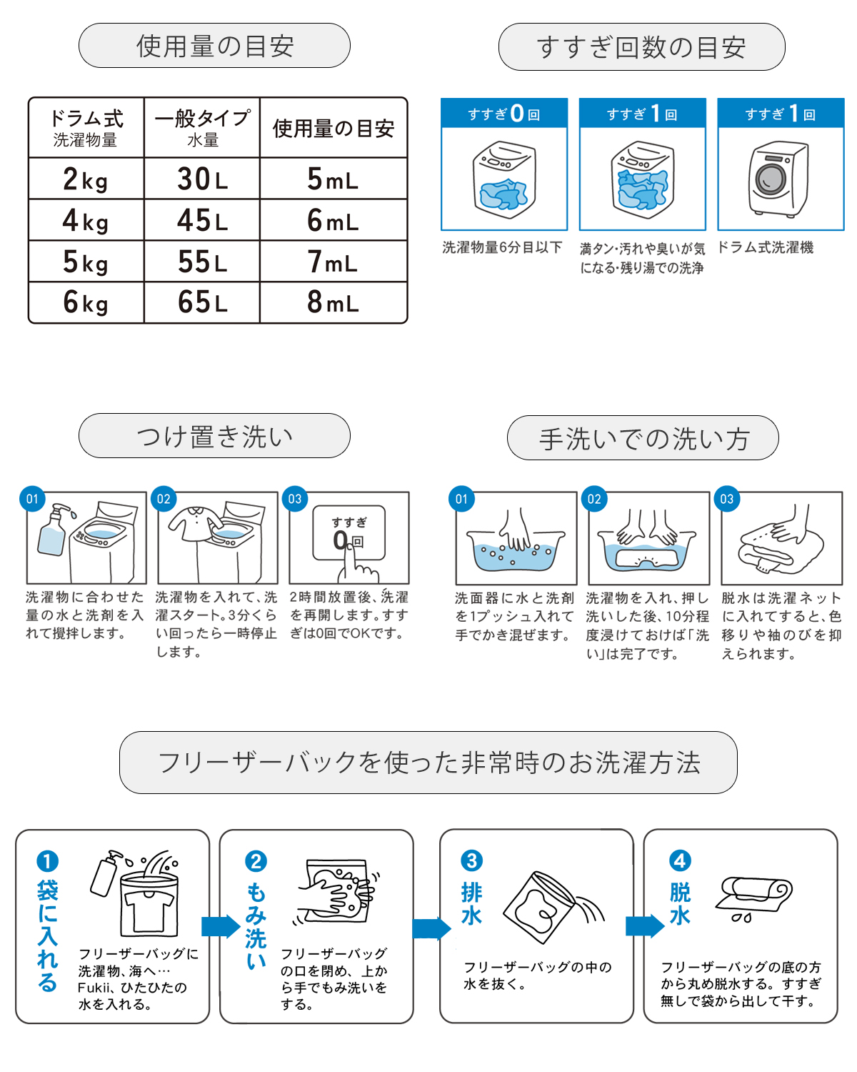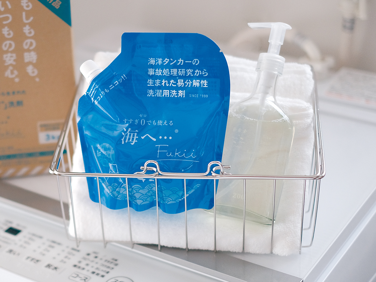 ●人にも、自然にも、優しい洗剤。「海へ…Fukii」 ●すずぎゼロで節水・節電・時短 ●うすめてスプレーボトルに入れれば、家中のおそうじにも!