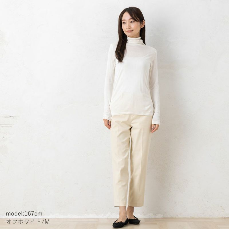 シャツや首元のチクチクが気になるニットなどのインナーとして活躍するハイネックTシャツ。重ね着してももたつきにくい、ゆるりと体のラインに沿うシルエットです。