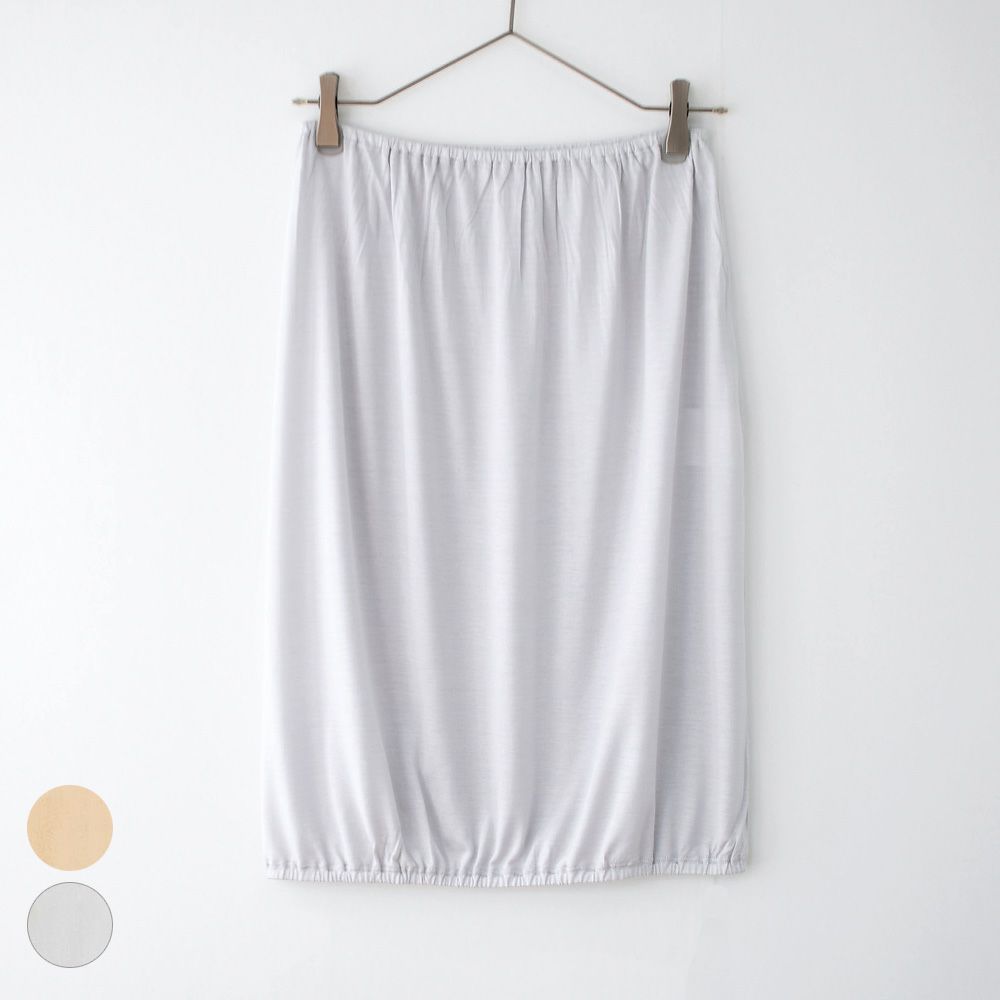 ウエストと裾にゴムを通して、たっぷりゆとりのある身幅に仕立てたシルク ペチコート。裾にもゴムが入っていますが、余裕をもたせた裾幅ですから締め付けもないし、肌にも生地がまとわりつかず、汗ばむ季節に心地よく過ごせます。薄くて軽いシルク生地だから、表に響きにくいのが嬉しいポイント。 吸放湿に優れたシルクは汗をかいてもすぐにサラサラ。透け防止インナーとしてはもちろん、股ずれ対策や、さらに汗取り・冷えとりアイテムとしても活躍してくれるシルクインナーです。