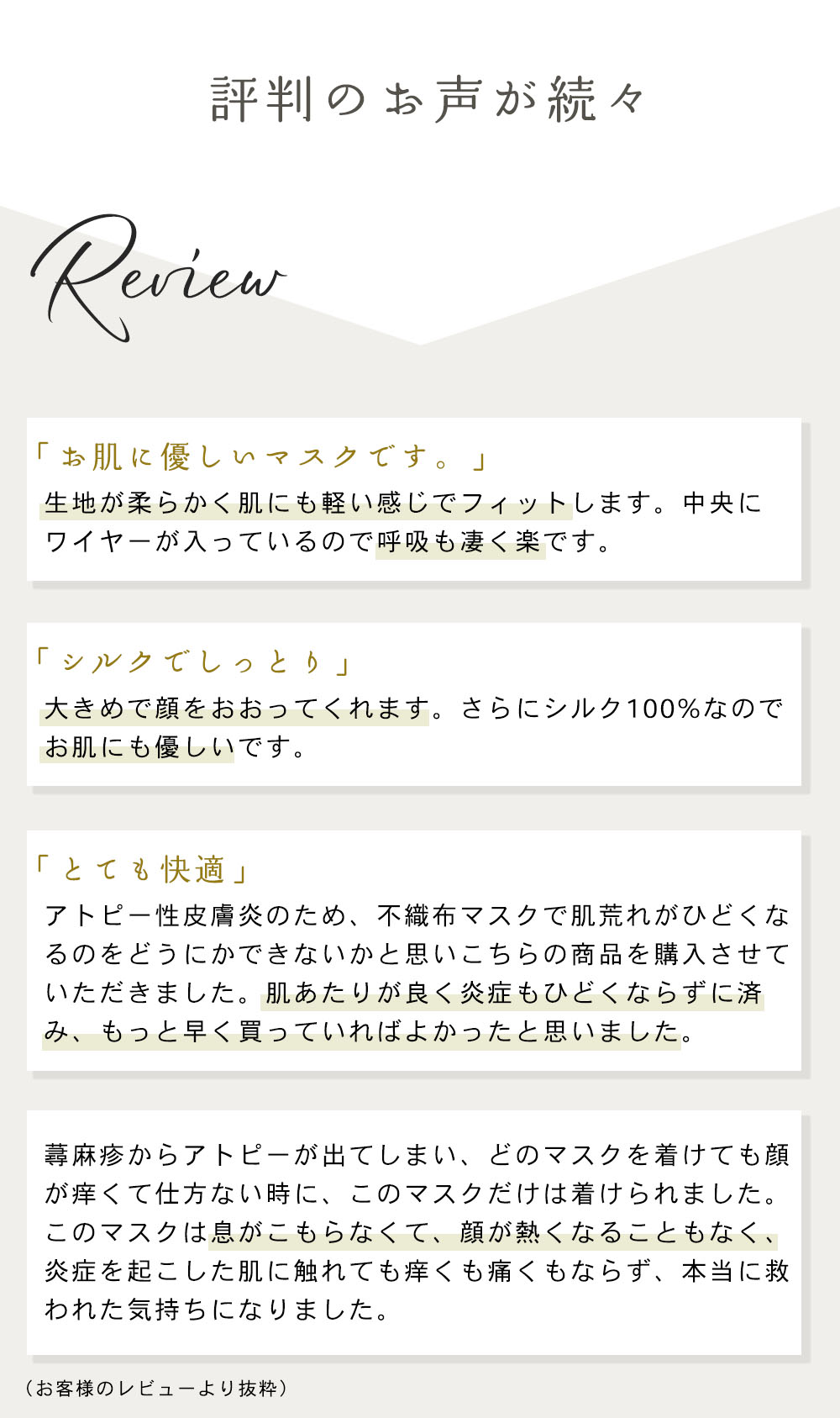シルク素材は口元に張り付きやすく呼吸がしづらい・・・そんな声にお応えして、中央にワイヤーを縫い付けました。口元に空間ができ、呼吸がしやすく就寝時も快適。ワイヤーは柔らかく形状が変えやすいものを使用しています。