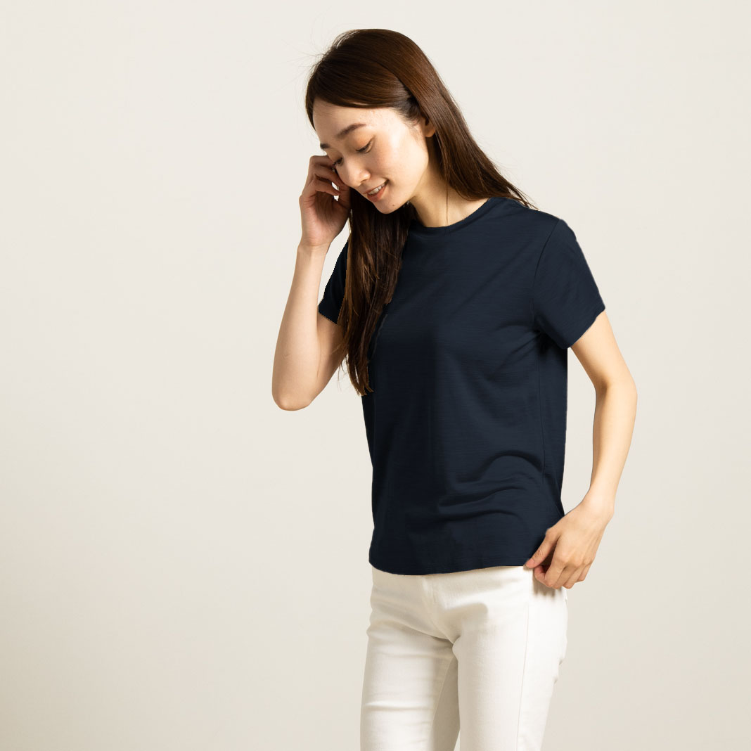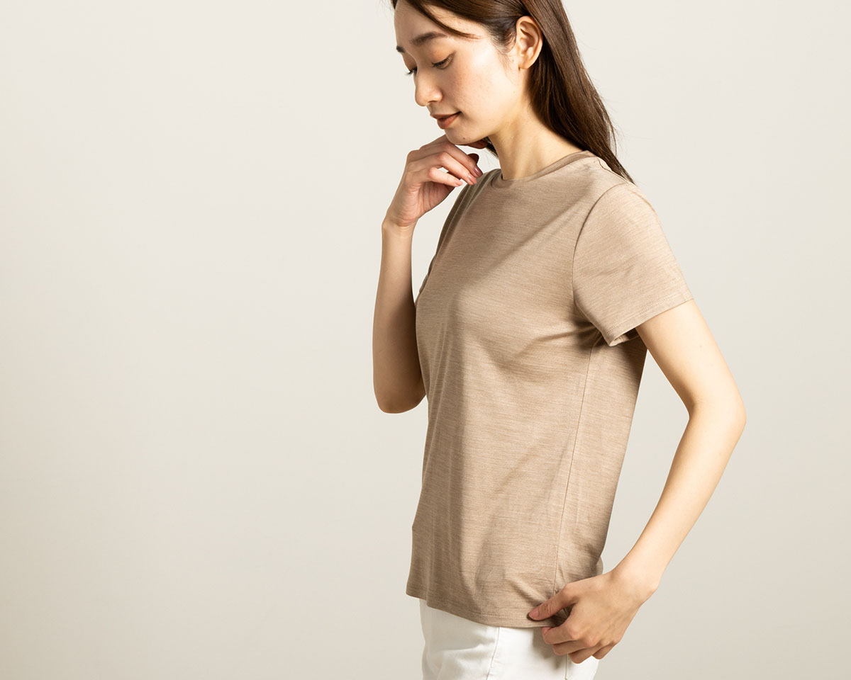 当店定番のお肌に溶け込むようなシルク100%ジャージーで仕立てた 半袖Tシャツ。 シンプルでも野暮ったくなく、絶妙なカッティングとシルエットで着回し力もバツグン! 身につけたときのしなやかな着心地は、 シルクジャージーならではの贅沢さを改めて実感させてくれるはず。 吸放湿性に優れた絹だから、汗をかいてもすぐにサラサラ。 手洗いOK、安心の日本製。