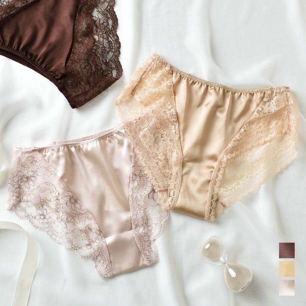 フロントはすべすべのシルクサテンで仕立て、ほんのり艶感が美しい。シルク特有のしっとりした肌触りと艶感を持つシルクサテンは、汗をかいてもべたつきにくく、快適に過ごせます。 ヒップ側は中央がシルクサテン、サイドからヒップにかけてレース仕立てで透け感があり、レース本来の美しさを堪能できます。アウターにも響きにくく、タイトなパンツスタイルもきれいに着こなせます。