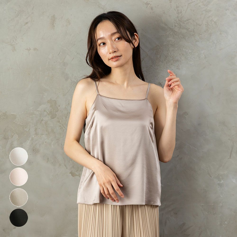 上品な光沢感と美しいドレープを持つシルクサテン素材で仕立てたカップ付きキャミソール。フラットなネックラインで一枚でも着やすいブラトップは、ブラジャーの締め付けから開放される、リラクシーな着心地に。すべりがよいシルクサテン素材は薄手で軽やか、さらりと一枚で上品魅せしてくれる、大人のブラキャミソールです。