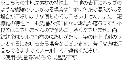 ※天然繊維の性質上、お洗濯の際にどうしても縮みが起こる可能性がございます。何卒ご了承下さいませ。また、大変デリケートな素材ですので、お取り扱いには十分ご配慮下さいますようお願い申し上げます。