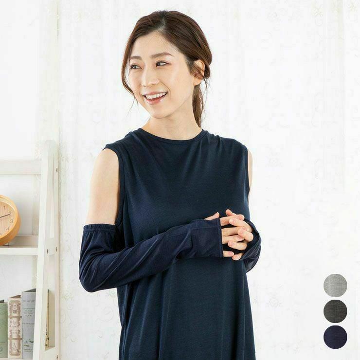 2度ほど洗いましたが、二の腕にぴったりフィットして、今のところずり落ちてくることはありません。以前、他社品で(素材は不明)似たようなアームカバーを使っていたところ、すぐにずり落ちてくるようになったので、ありがたいです。そういえば、暑苦しさも特に感じないかも。すでに購入していたインナーのフレンチ袖と同じネイビーにしたので、一緒に着ているとセットのような見た目の落ち着きがあります。
