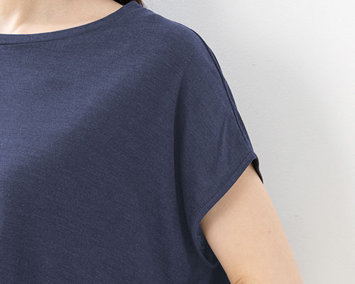 身幅をゆったりとって楽に着られるトップス。半袖よりすっきり見えするフレンチ袖デザインで、風通しよく涼しくお過ごし頂けます。身頃両脇にAラインのマチが入ることで、よりゆったり、リラクシーな着用感に。体型隠しにもぴったりです。シンプルで着回しの効くデザインですから日常使いのトップスとしても。