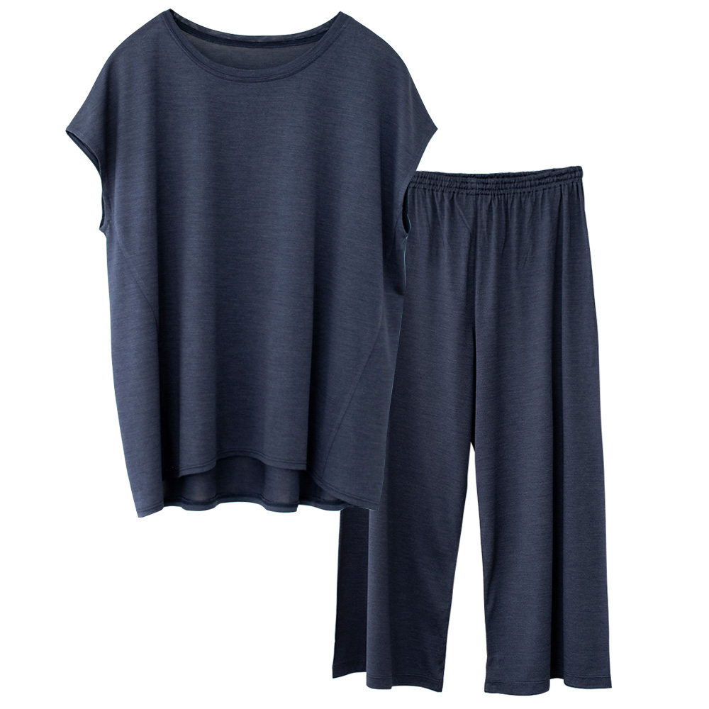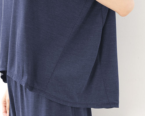 シルク100% ソフトジャージー パジャマ 上下セット フレンチ袖トップスとガウチョパンツ 日本製モデル身長167cm/紺色