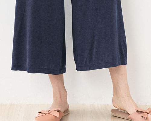 ふんわりと軽やかな生地に、締め付けのないゆとりのあるシルエット。 リラックス感たっぷりのルームパンツです。ウエストゴムで締め付けが少なく、 裾に向かって広がるゆったりAラインがさりげなく体系をカバーしてくれます。当店定番ガウチョパンツより少し丈を短くして、すっきり履けるデザインにしました。