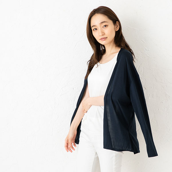 インナー次第で印象ががらりと変わるシンプルなカーディガンは、くつろぎモードからお仕事モードまで、幅広いシーンで使える便利な一枚。ブラトップにさらりと羽織る着こなしも。シルク素材なので、湿気や汗を吸収&発散してくれ、ジャケットよりも快適&手軽にきちんと感を出してくれます。 |