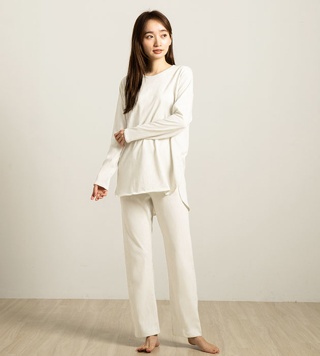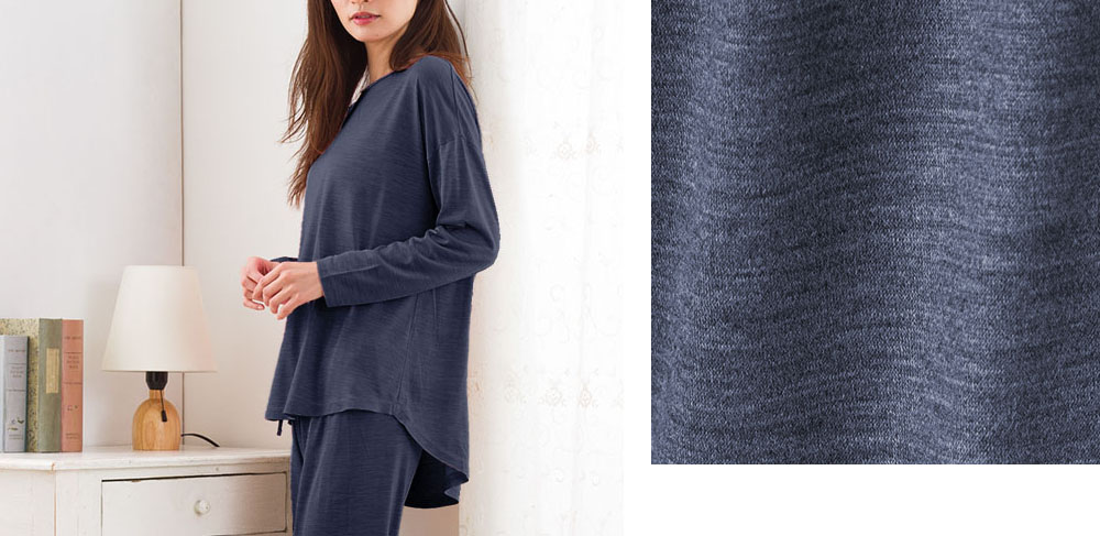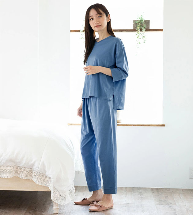 ソフトなコットンとしなやかなシルクを合わせた、肌あたりのよい軽やかな生地を使用。 薄手で柔らかく、春夏シーズンに気持ちよい素材感です。 程よいゆとり感があり、風通しが良く、体型も楽々カバーしてくれる、 大人の春夏リラックススタイルにぴったりのルームウェアです。 |
