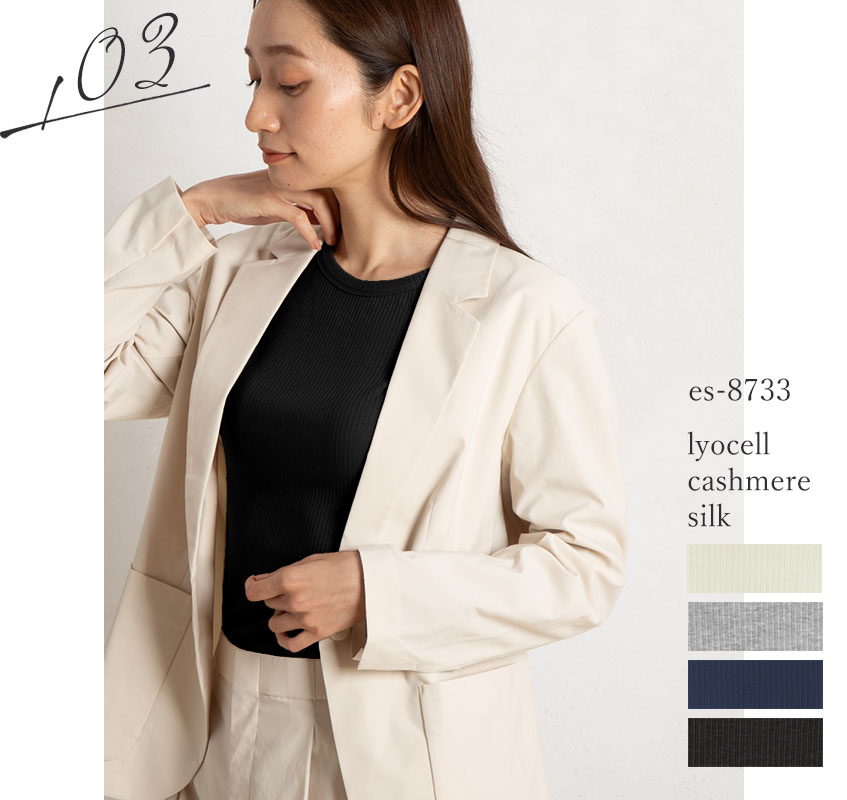 | ストレッチ性に優れた生地で、とろんととろみ感が心地良い一枚。身体のラインに滑らかに沿い、窮屈感なくお召し頂けます。薄手でインナーとしても着回しやすく、カーディガンやジャケットのインにも。 |
