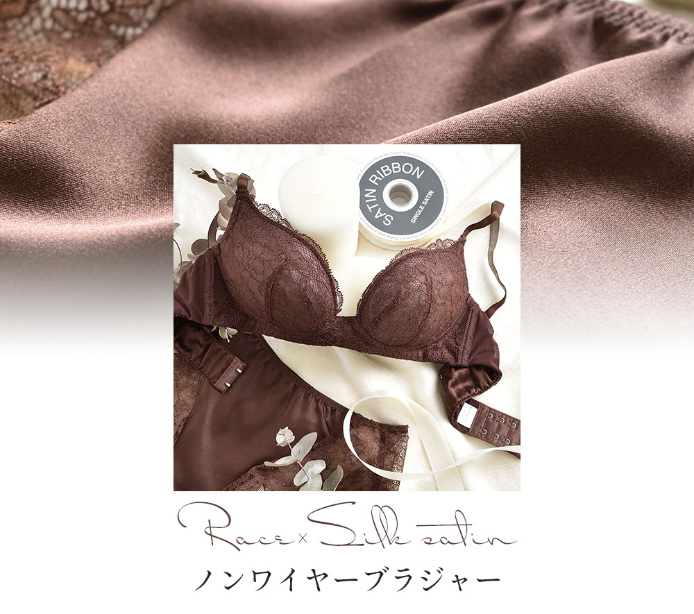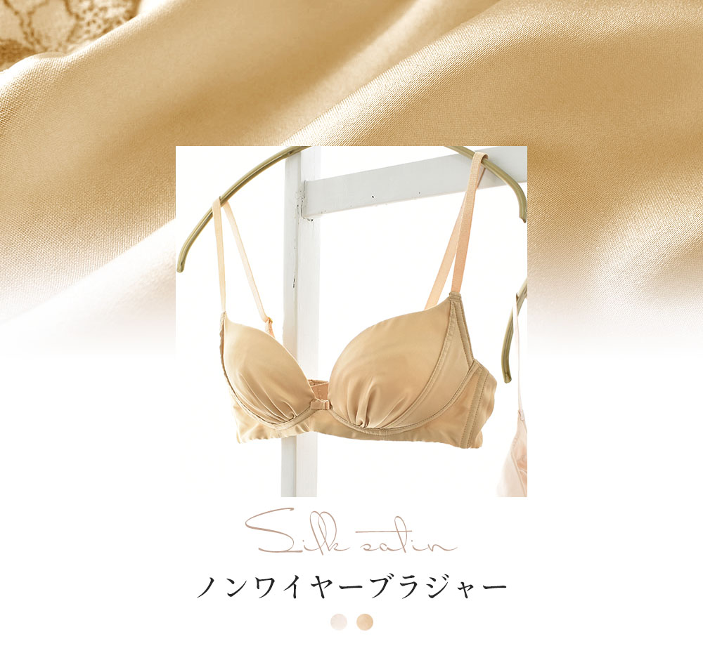 副資材以外、シルクサテンを全面に使い、艶やかな見た目の美しさと、すべやかな肌触りが贅沢なブラジャー。付け心地にもこだわり、フィット感の良さと楽な付け心地を追求。締め付けすぎないのに、バストをしっかり寄せて上げてくれ、こんもり谷間が作れちゃいます。