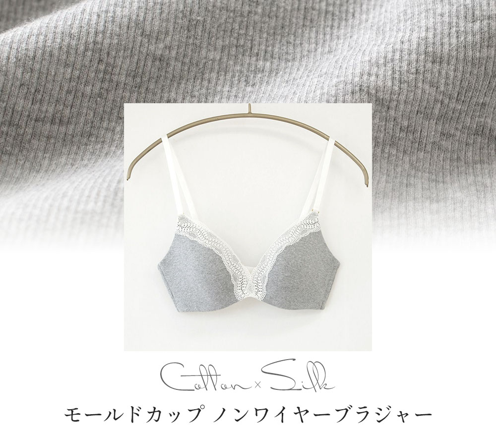 本来のバストの形を活かしながら、自然な丸みと美しいシルエットに整えてくれるモールドカップ。カップ裏はふんわりと軽やかなタッチのシルク100%生地。 |