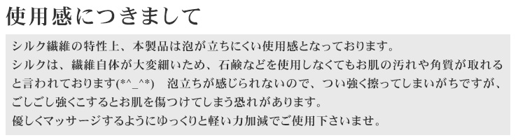 ◆このタオルは身体洗い専用です ◆こすりすぎにご注意ください ◆ご使用後は、水やせっけんを良くきって乾燥させてください。 ==================== シルクのお手入れ シルクは手洗いできます。 必ず中性洗剤(またはシルク専用洗剤)を使って手洗いしてください。 ・絶対に、違うお色のものと一緒に洗わないで下さい。 ・漂白剤または漂白剤入りの洗剤は使用しないで下さい。 (漂白剤で色が落ちますので) ・形を整え直射日光を避けて陰干しして下さい。 (直射日光は黄変の原因になります。) ・乾燥機に入れないでください(縮み率が大きくなります) ・濡れた状態で放置すると色移りの原因になります。 ※天然繊維の性質上、お洗濯の際にどうしても縮みが起こる可能性がございます。何卒ご了承下さいませ。また、大変デリケートな素材ですので、お取り扱いには十分ご配慮下さいますようお願い申し上げます。